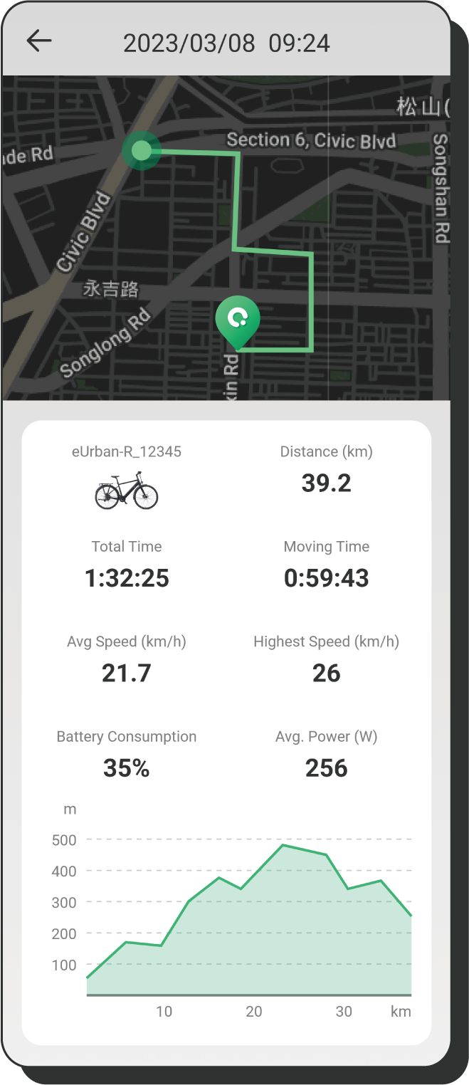 自動記錄每次騎行,監測距離、時間、速度與電量,提供更智慧的騎乘分析