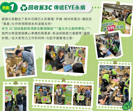 除環境面向外,部分回收及捐贈之物資亦透過集團安排,轉贈予合作之公益與社福單位,延續物品使用價值,支持弱勢關懷與社會公益,體現企業對社會責任之重視。